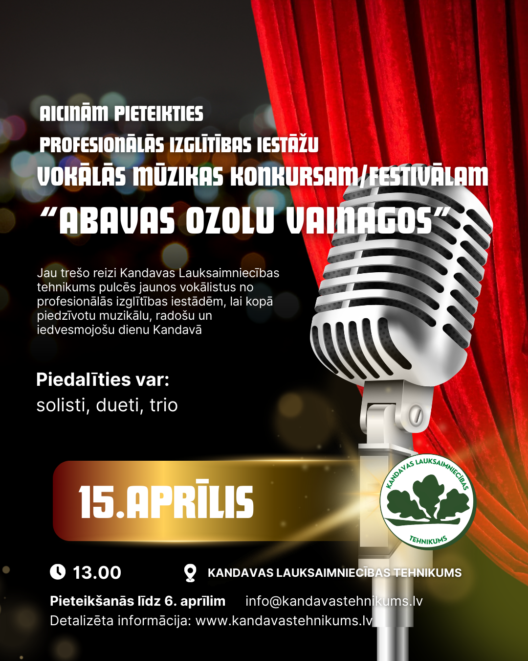Jau trešo reizi Kandavas Lauksaimniecības tehnikums pulcēs jaunos vokālistus no profesionālās izglītības iestādēm, lai kopā piedzīvotu muzikālu, radošu un iedvesmojošu dienu Kandavā.