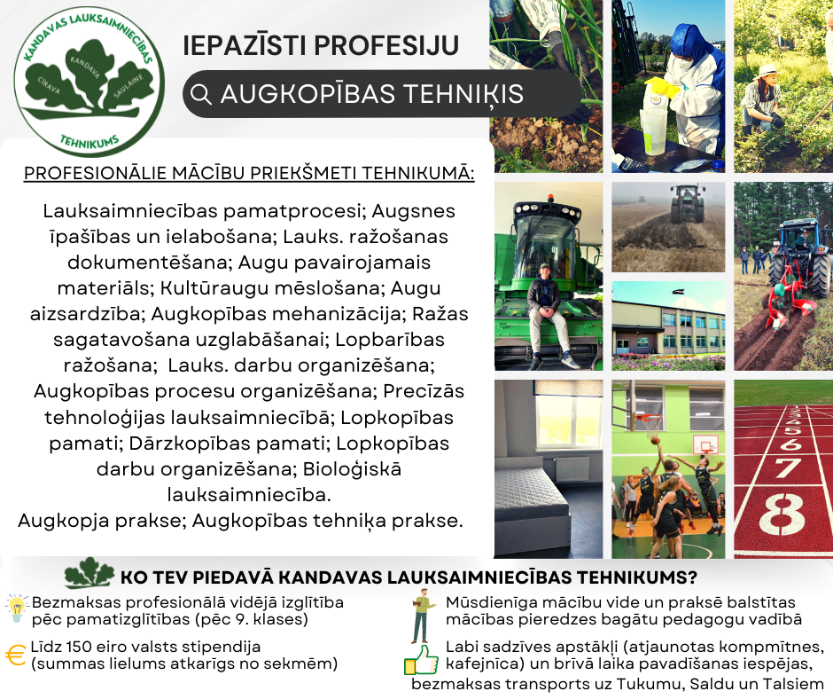 Viens no tehnikuma jaunumiem, sākot ar 2022./2023. mācību gadu, ir iespēja iegūt kvalifikāciju “Augkopības tehniķis” Kandavā (izglītības programma “Augkopība”).