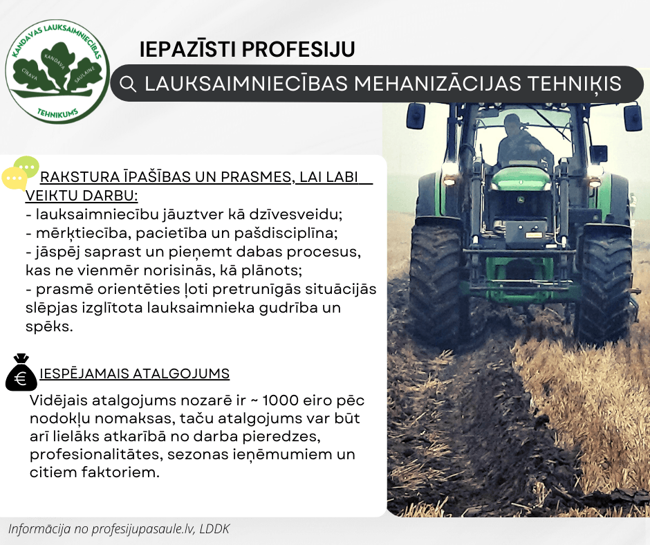 🚜Lauksaimniecības mehanizācijas tehniķa profesijā svarīgas ir ne tikai zināšanas par lauksaimniecības tehniku, jāizprot arī lauku saimniecības pamatprocesi un jāorientējas agronomijas un lopkopības pamatos.