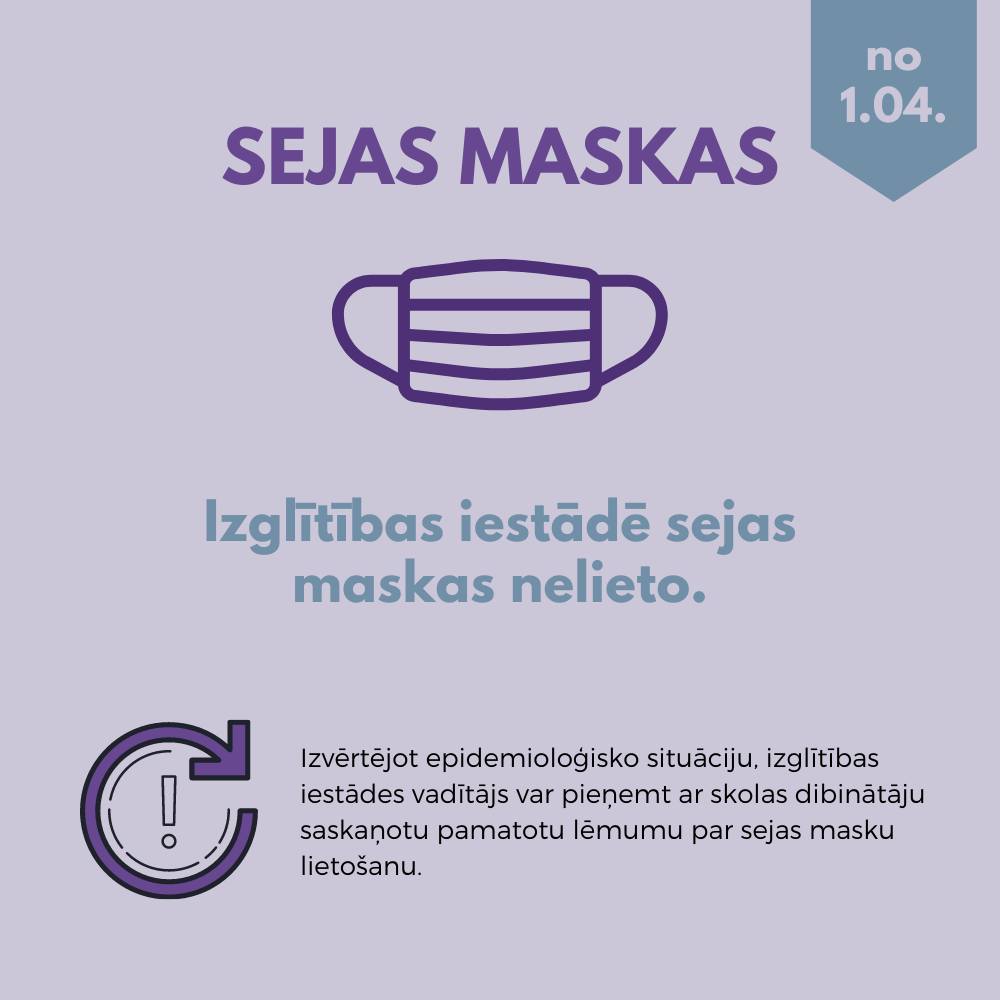 No šā gada 1.aprīļa izglītības iestādēs vairs nebūs spēkā nosacījums par sejas masku nēsāšanu. Taču, izvērtējot epidemioloģisko situāciju, atsevišķos gadījumos izglītības iestādes vadītājs būs tiesīgs pieņemt ar skolas dibinātāju saskaņotu pamatotu lēmumu par sejas masku (t.i. nemedicīnisku (auduma) aizsegu) lietošanu (valsts vai valsts augstskolu dibinātas vispārējās un profesionālās izglītības iestādes vadītājs, augstskolas vai koledžas vadītājs pieņem lēmumu bez saskaņošanas ar dibinātāju). Savukārt testēšanu no 1. aprīļa varētu veikt tikai atsevišķos gadījumos – piemēram, ja parādās Covid-19 saslimšanas simptomi vai ir bijis kontakts ar Covid-19 inficētu personu mājsaimniecībā.